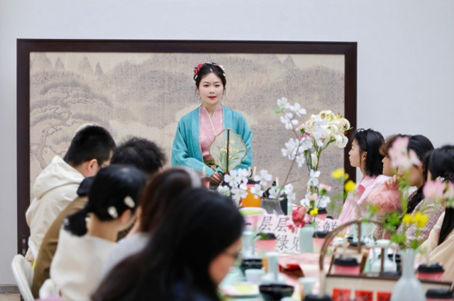 此次联名的亮点之一,是杭州博物馆内举办的一系列趣味活动。3月19日,“YEYE茶室·早春第一杯品鉴会”率先启幕,十位身着粉绿系服装的“粉绿主理人”沉浸式体验宋式点茶,在碾茶、击拂中感受传统茶事的雅致意趣。陶瓷DIY环节中,参与者亲手揉捏陶土、雕琢杯型,将春日期许融入作品。闻香猜茶环节趣味横生,众人凝神辨识茶香,猜中后的欢呼声此起彼伏,现场气氛热烈。新品品鉴区人气高涨,鲜醇茶饮令参与者沉浸于传统茶文化的雅致与趣味之中,满室春意盎然。